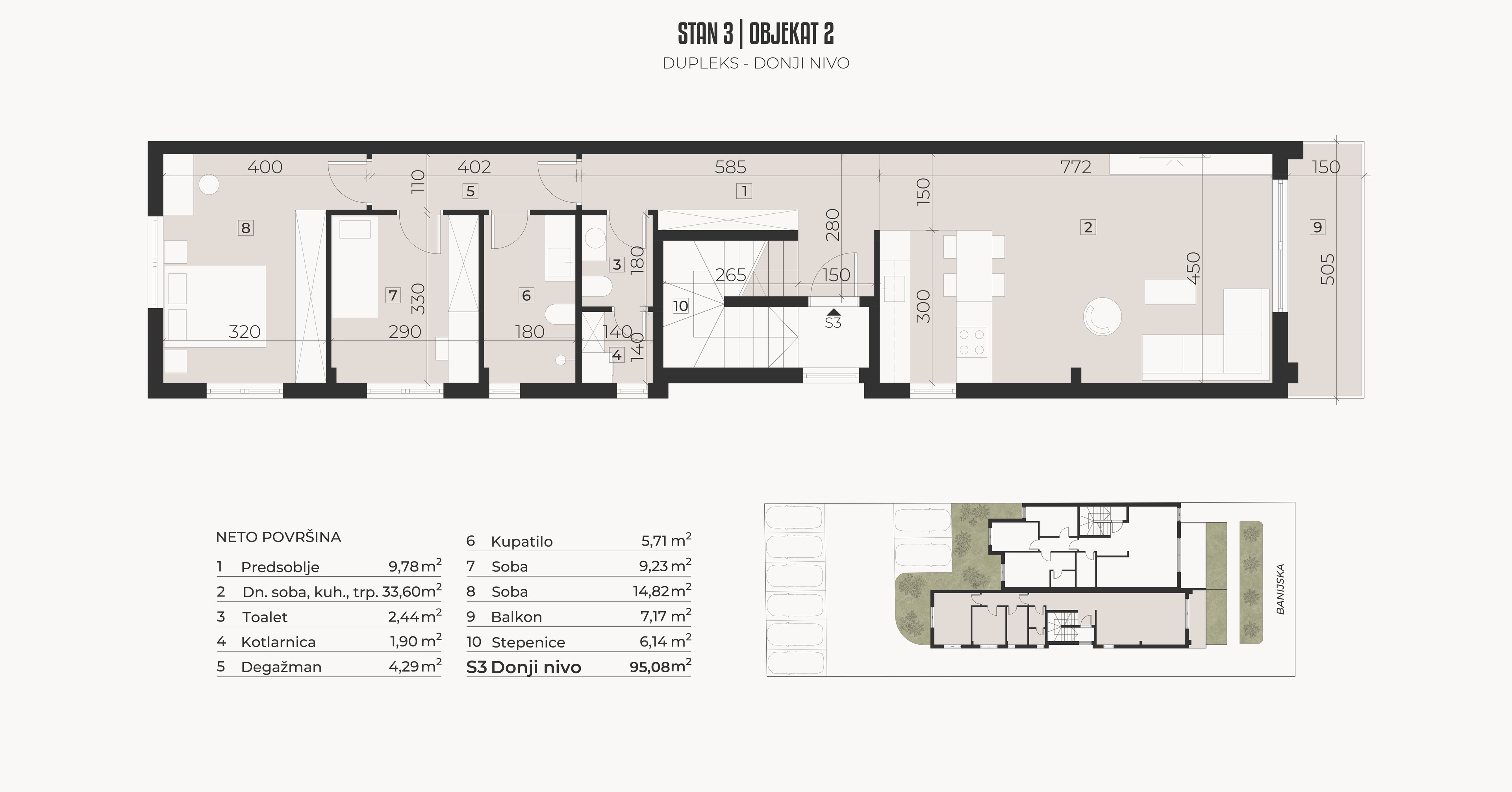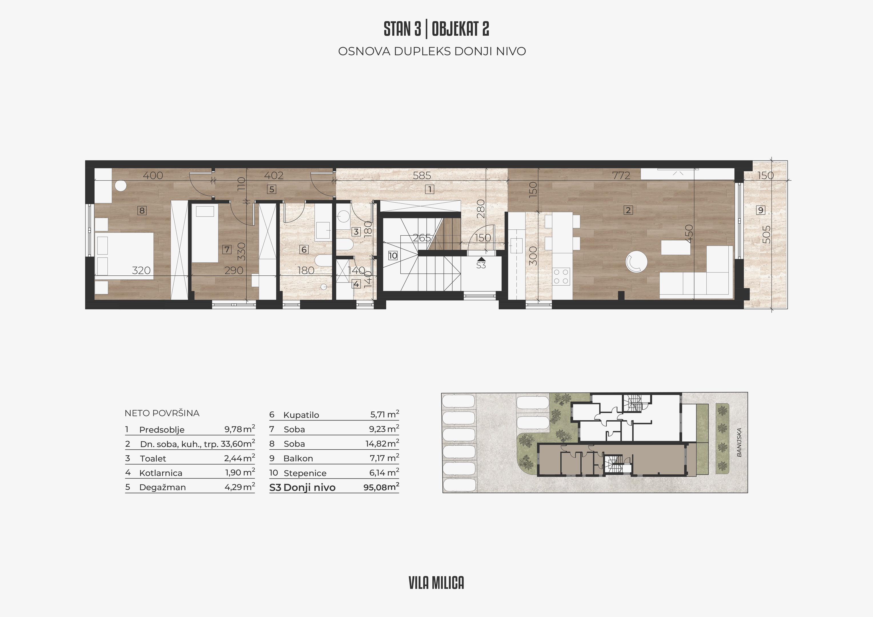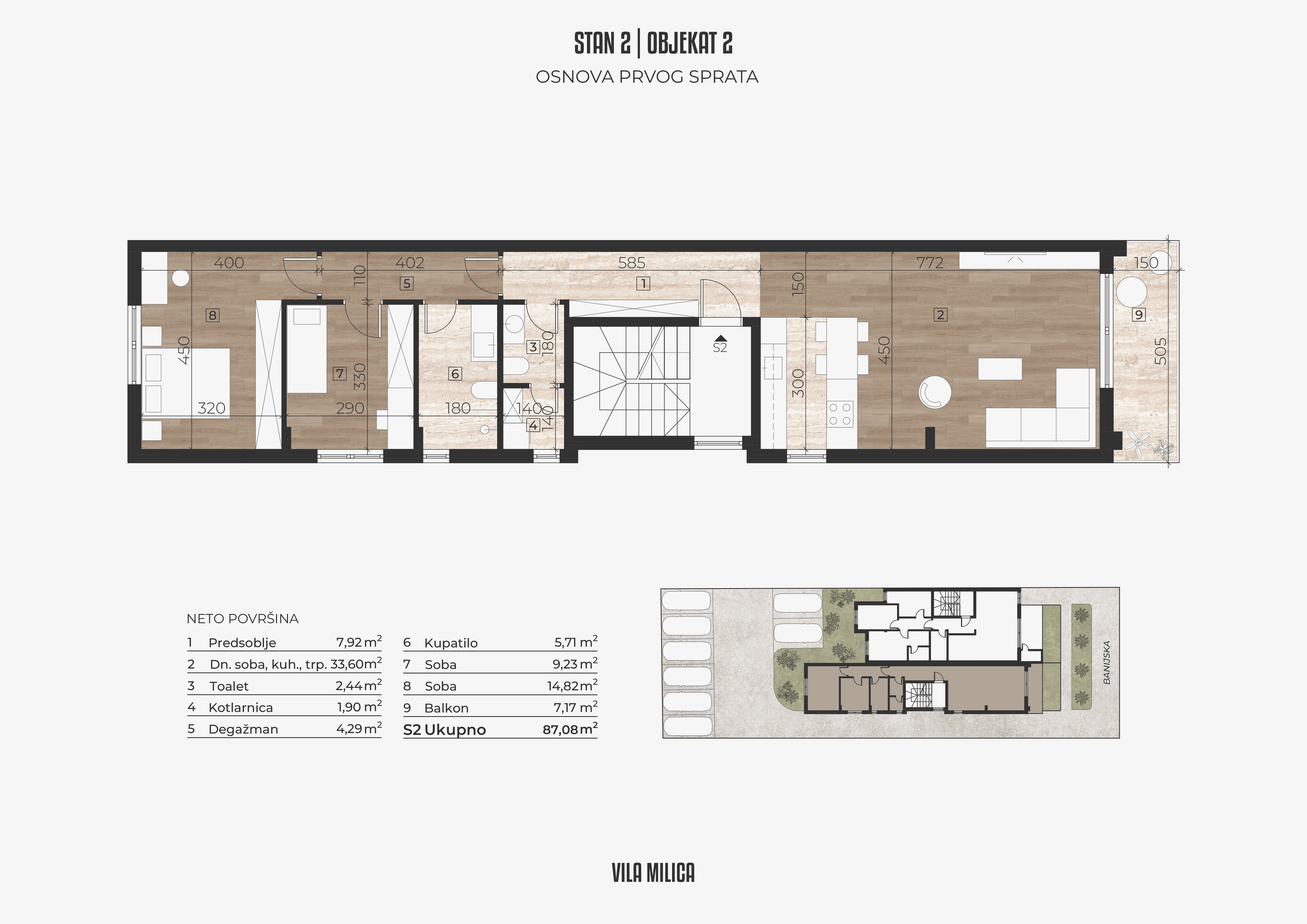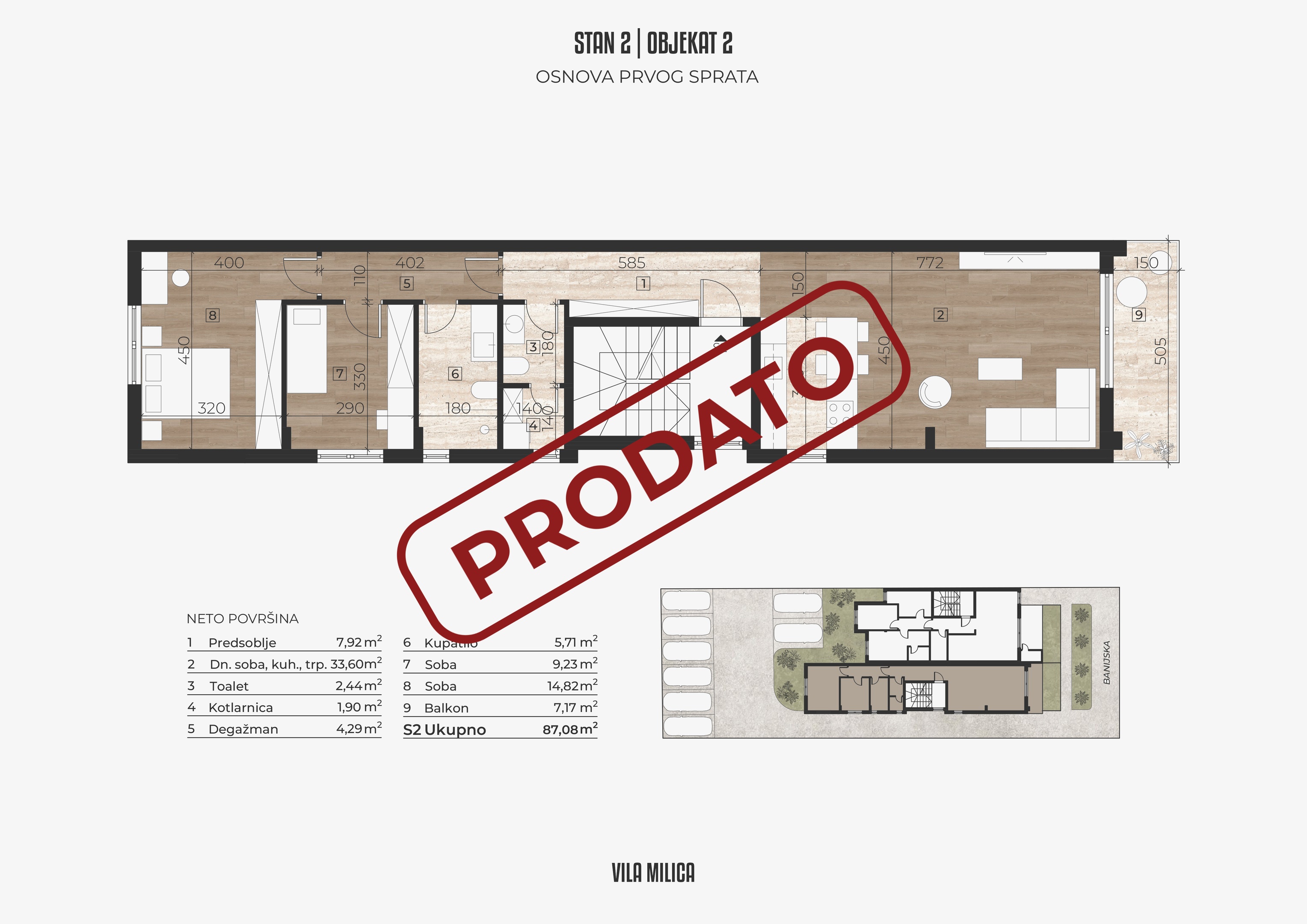 Objekat u svom sastavu ima 6 prostranih stanova, raspoređenih u 2 odvojena ulaza. U dvorištu se nalazi 8 parking mesta namenjenih isključivo stanarima. Građena od kvalitetnih materijala, sa modernim dizajnom i pažnjom na detalje, Vila Milica nudi spoj komfora, estetike i praktičnosti u mirnom okruženju.