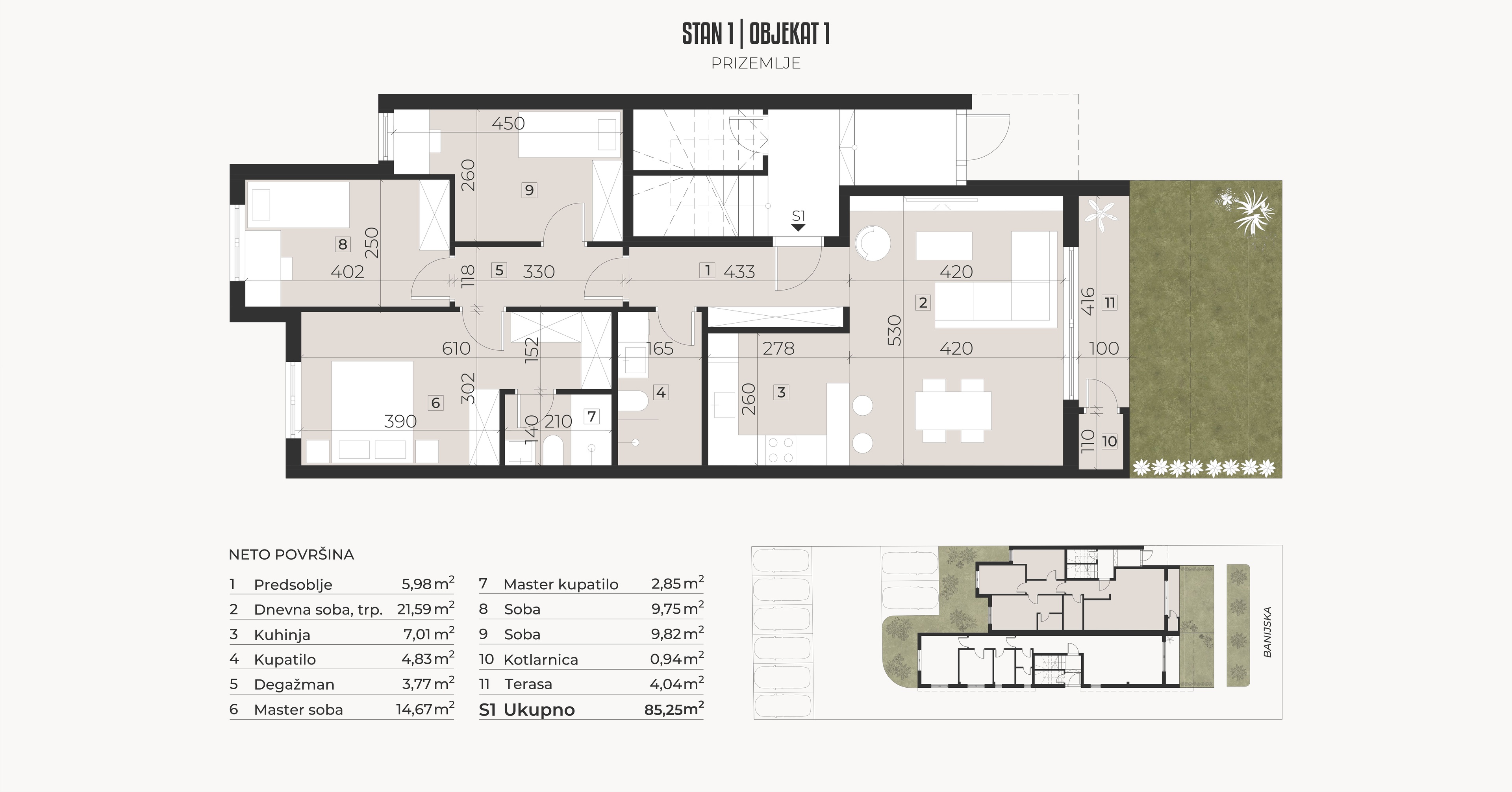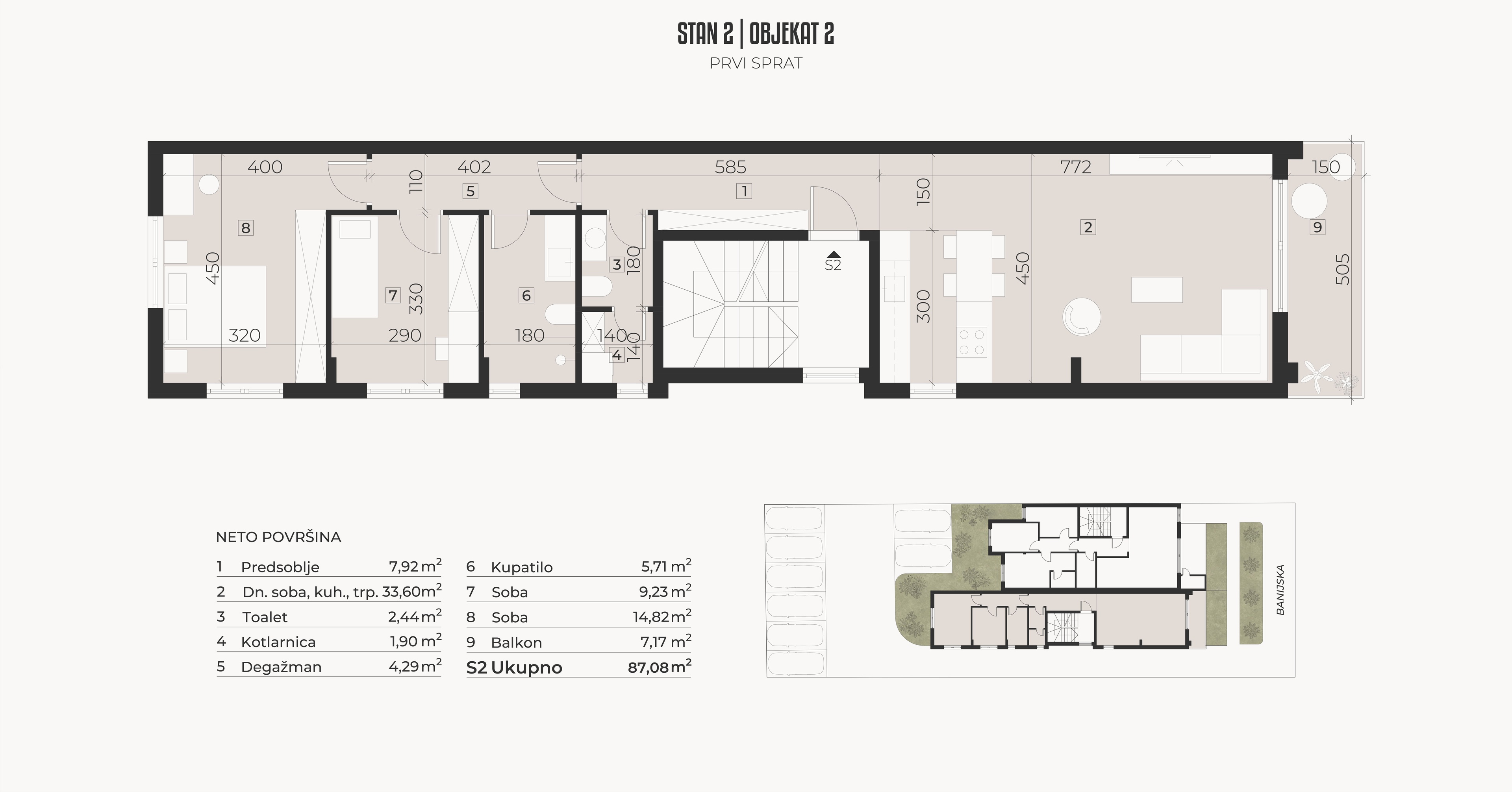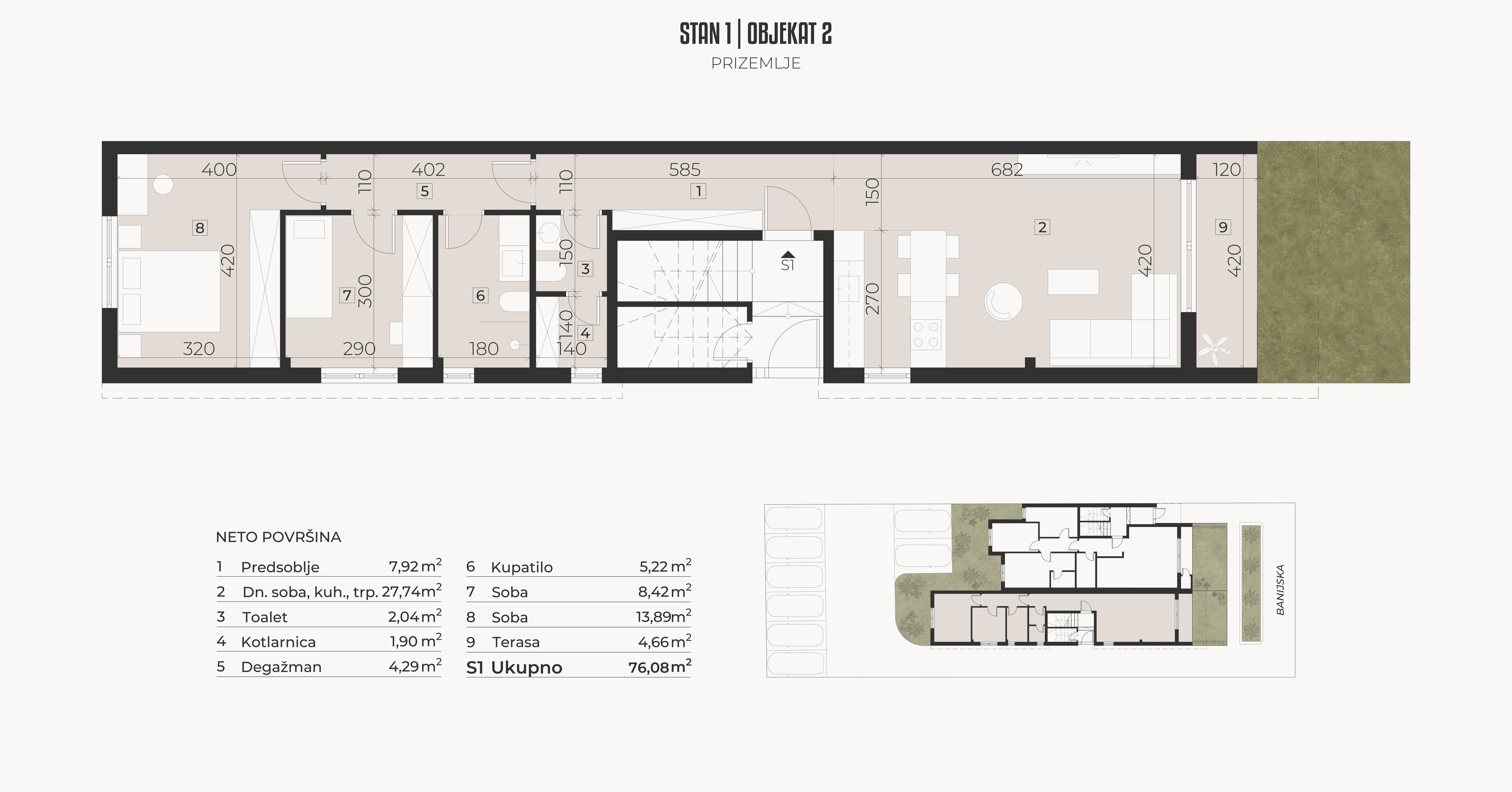 Objekat u svom sastavu ima 6 prostranih stanova, raspoređenih u 2 odvojena ulaza. U dvorištu se nalazi 8 parking mesta namenjenih isključivo stanarima. Građena od kvalitetnih materijala, sa modernim dizajnom i pažnjom na detalje, Vila Milica nudi spoj komfora, estetike i praktičnosti u mirnom okruženju.
